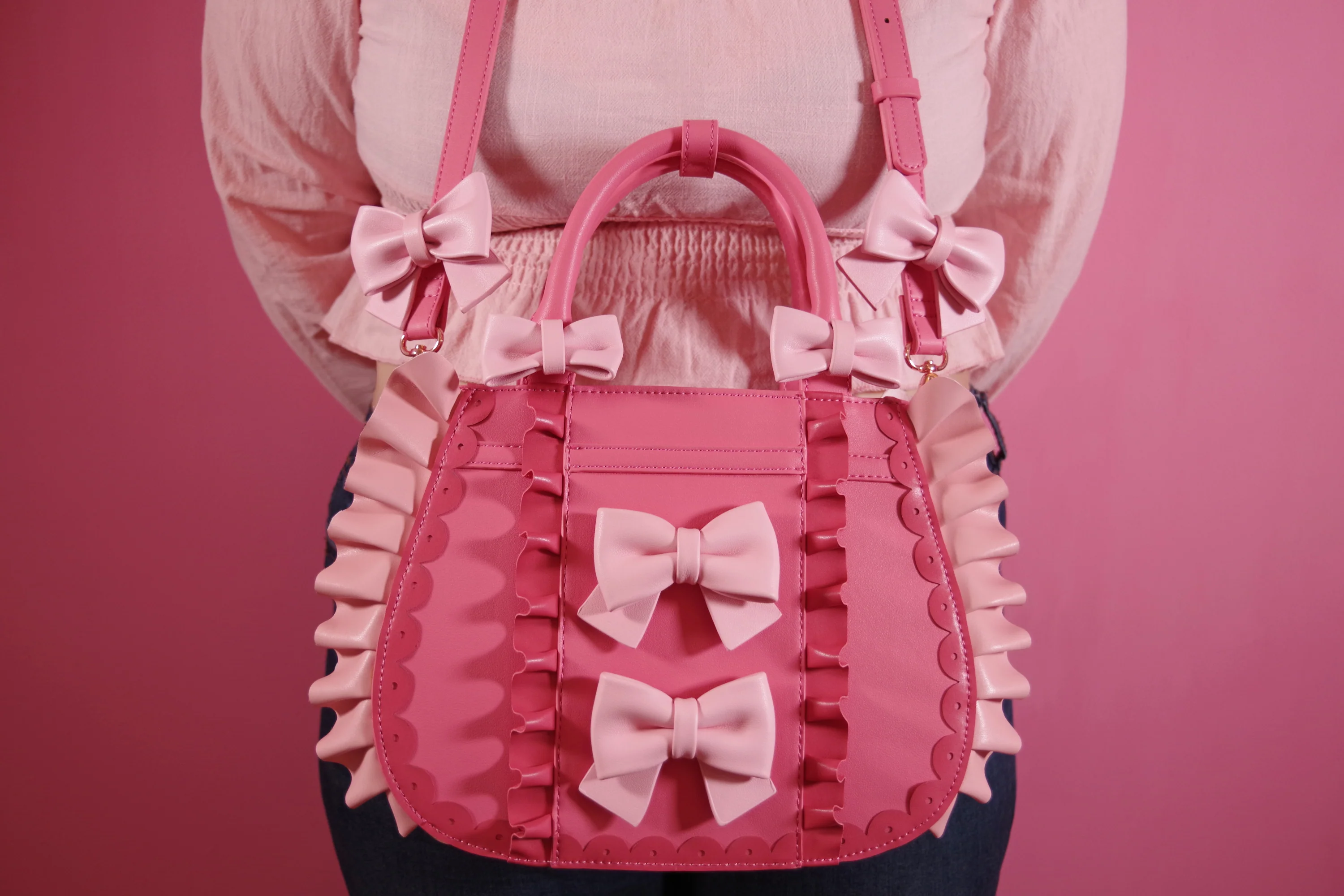 This sweet anime inspired satchel bag is full of bows and matches well with many coords, including lolita styles, rococo styles and kawaii alternative outfits. It's also wonderful to use as a cosplay accessory to rep your favourite character, or as a day to day bag. It features a romantic colour palette of baby pink and blush pink inspired by one of Chi's dresses from Chobits. It's a perfect medium size that can carry many essentials including your phone, a wallet and much more.