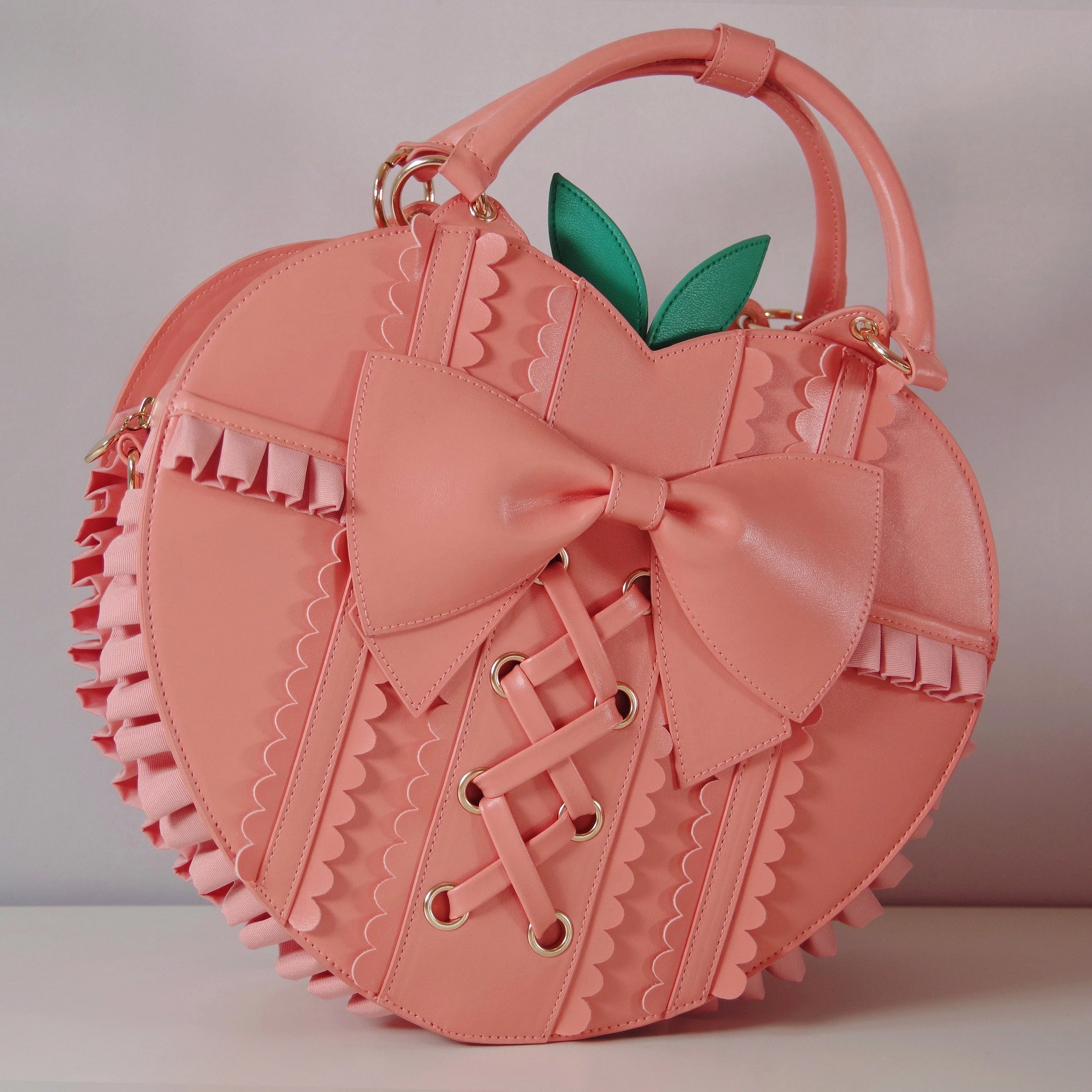 I'm so happy to share my original Frilly Fruits collection! This bag is inspired by the peach fruit, and is my second ever design. This stunning monochrome peach bag comes with removable "leaves" and is the perfect accessory for any occasion. Subtle enough for daily wear, yet fancy enough to pair with your favourite lolita or kitschy coords ♡