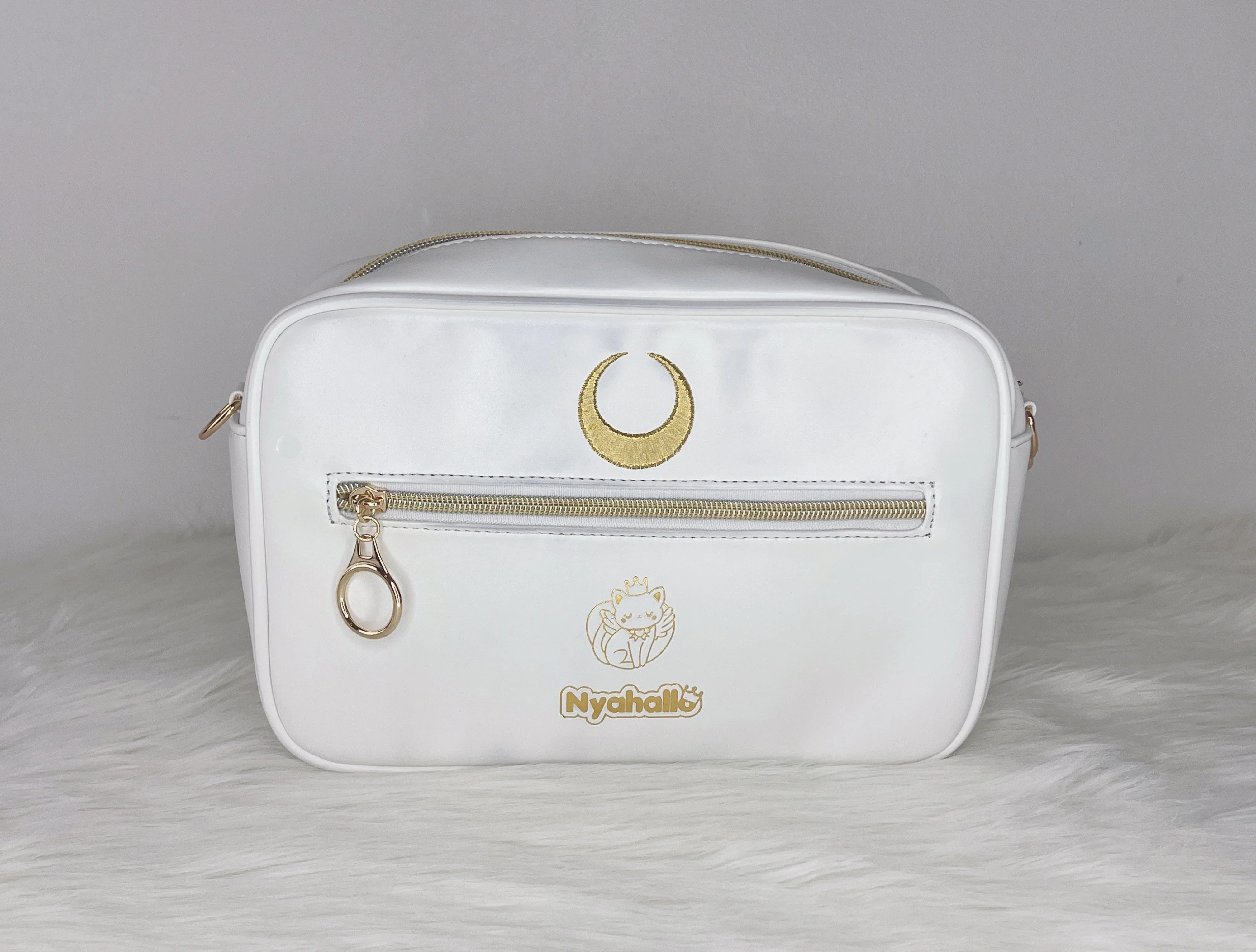 Feel like a princess with this chic embroidered crossbody bag! Simple yet elegant, this bag can carry all your basics while being a cute accessory to any outfit. Pure snowy white vegan leather contrasts with gold thread embroidery that shines and shimmers in the light.